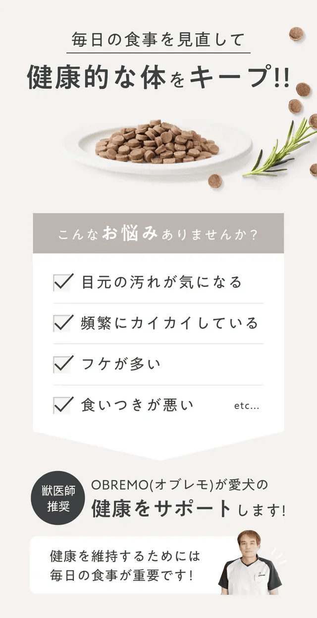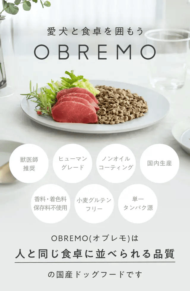 「OBREMO」は無添加で作られているフードで、オイルコーティングも施されていません。人工的な香りや保存料などを使っておらず、長く安心して愛犬に食べてもらえます。仕入れにも厳しい基準を設けており、人用として販売している「ヒューマングレード」のものだけに限定しているのが大きな特徴です。